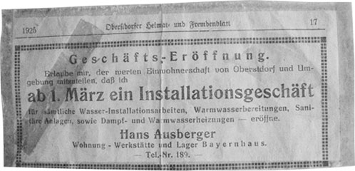 mit einer Anzeige in der Allgäuer Zeitung, die Eröffnung seines Installationsgeschäftes ankündigte.